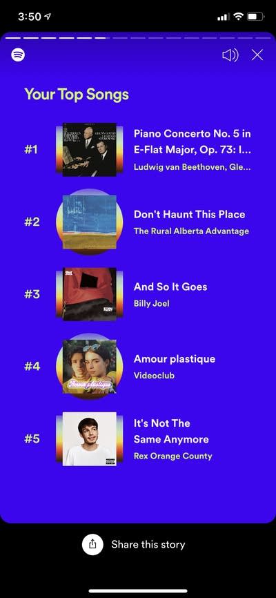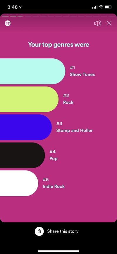 And Kai’s Spotify Wrapped, which is heavy on show tunes and sad indie rock.