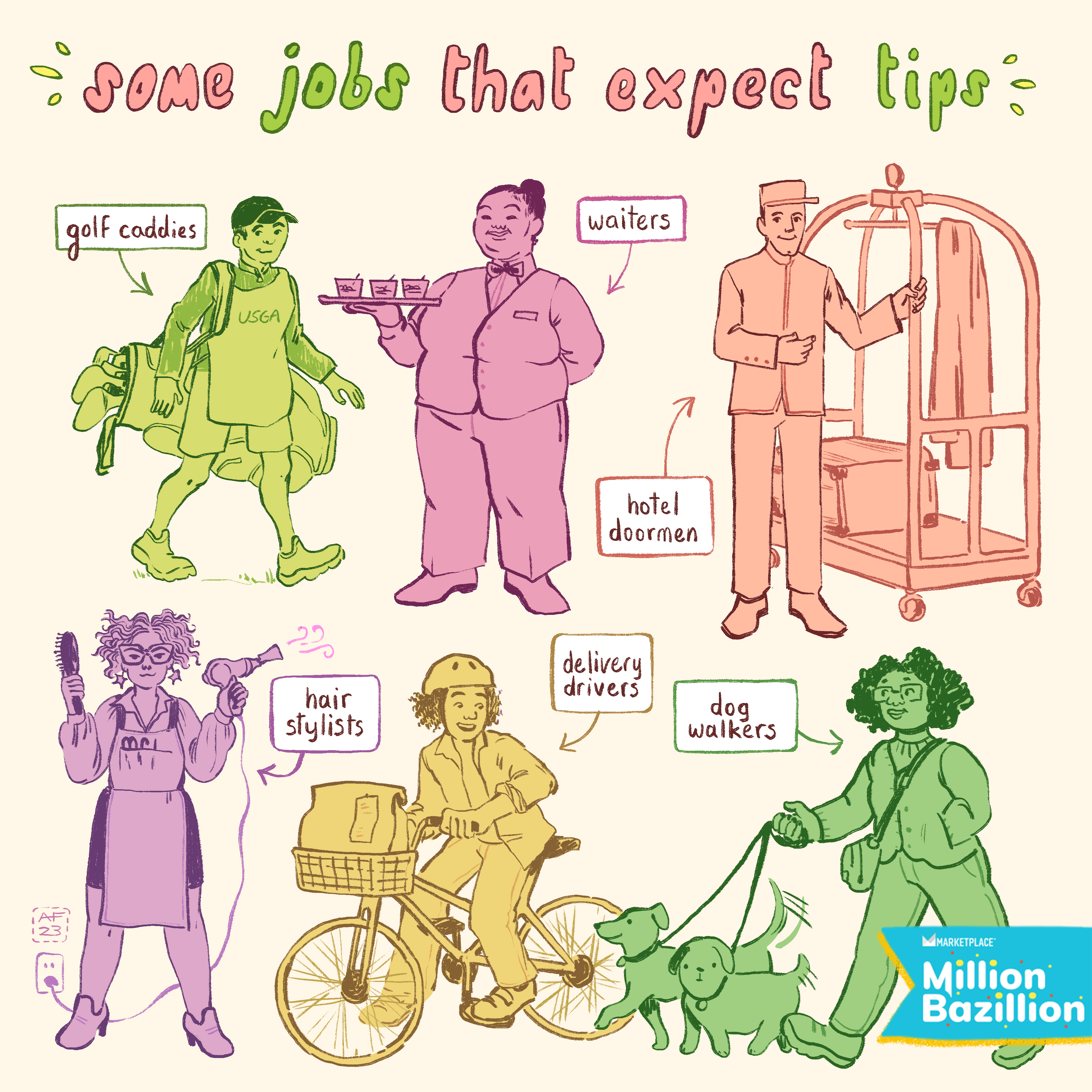 BRIDGET: Welcome back to Million Bazillion. Today, Ryan and I are answering the question: Why do some jobs get tips and others don’t? And we’re doing this all on a visit toHappy Land theme park and resort, surrounded by all our favorite characters of public domain fairytales.